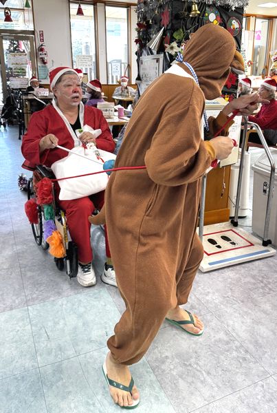 デイサービスになんとサンタさんとトナカイさんがそりに乗ってやってきたではありませんか!(笑)