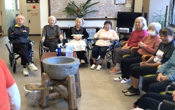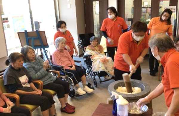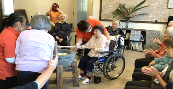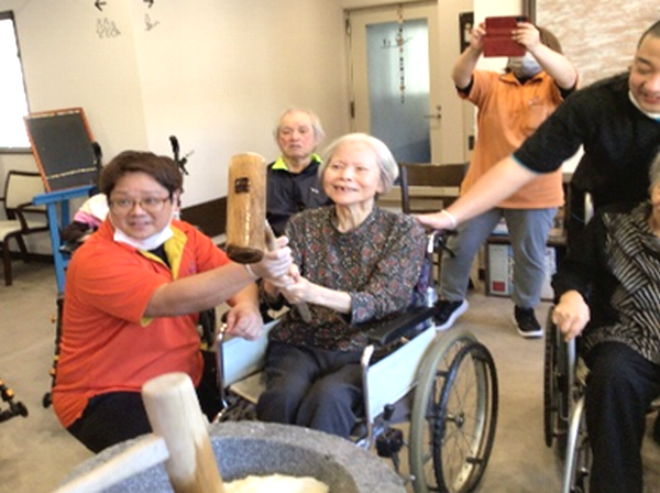 入居者様も、職員と一緒に杵を掴んで「うんとこしょ!」「どっこいしょ!」と、気持ちを込めて餅をついてもらいました~☆