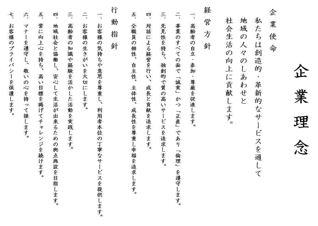 「人生100年時代」を豊かにするには、介護の仕事は重要な役割を担っており、持続可能な社会への貢献と、持続的な成長を実現するために、これからも地域から愛される企業、そして職員が心から誇れる企業であり続けられるよう努力してまいります。何卒、皆様のご支援とご指導を賜りますよう心よりお願い申し上げます。